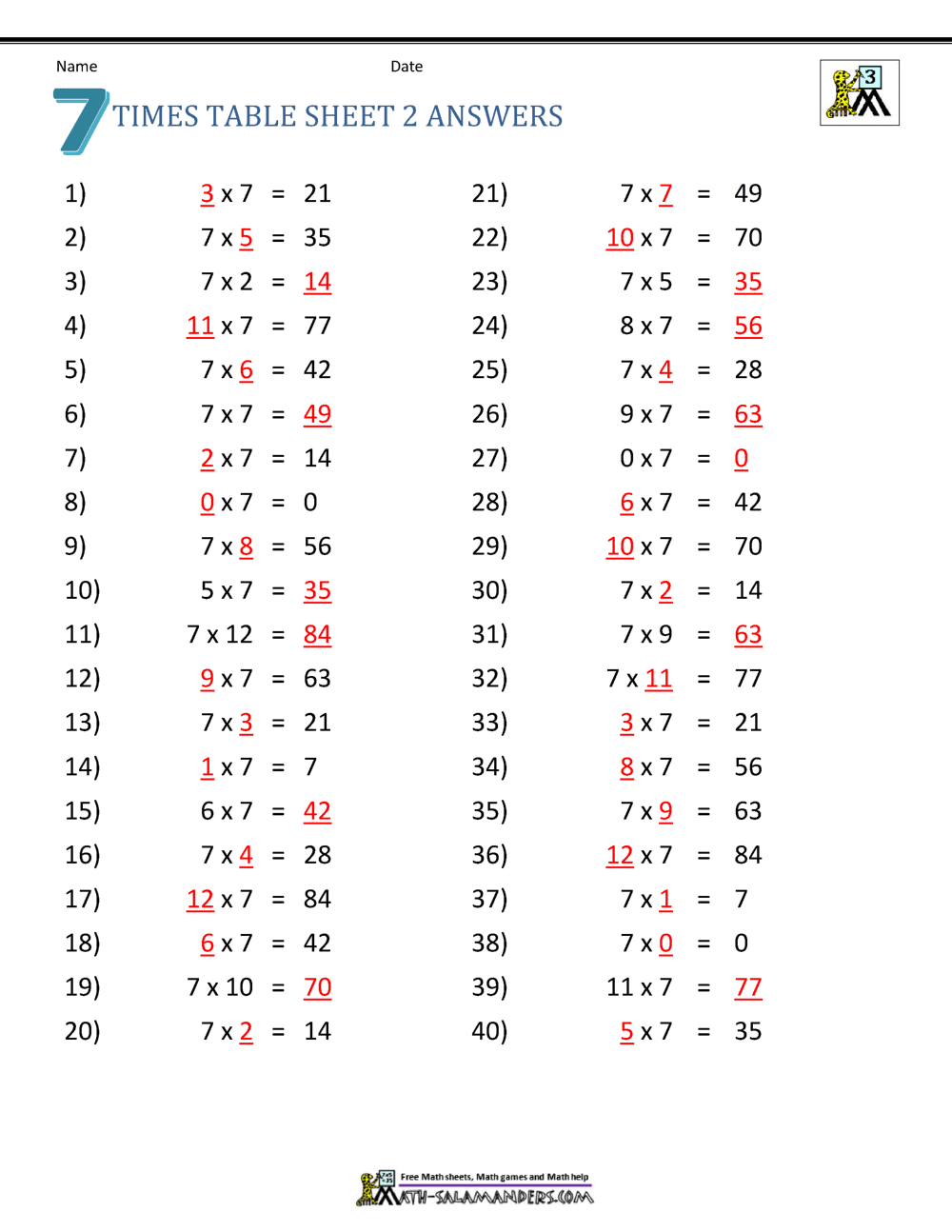 All numbers that are equal to 3 multiplied by an integer (a whole number) are multiples of 3 multiplication worksheets. You can download and print 7 times table worksheets here.
